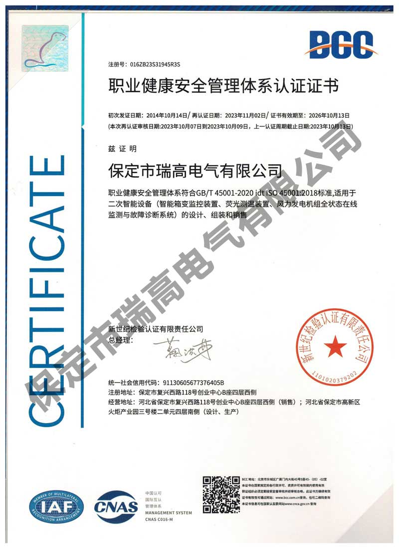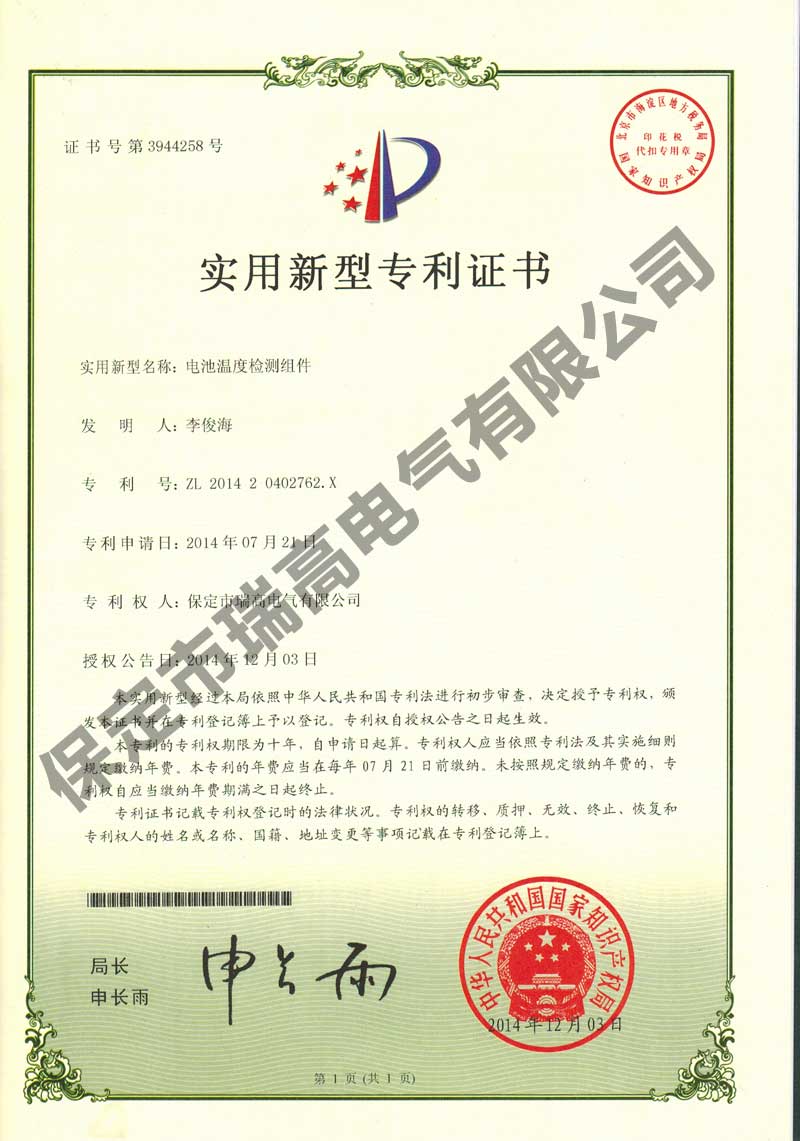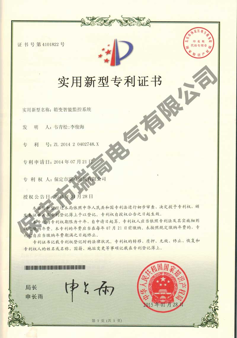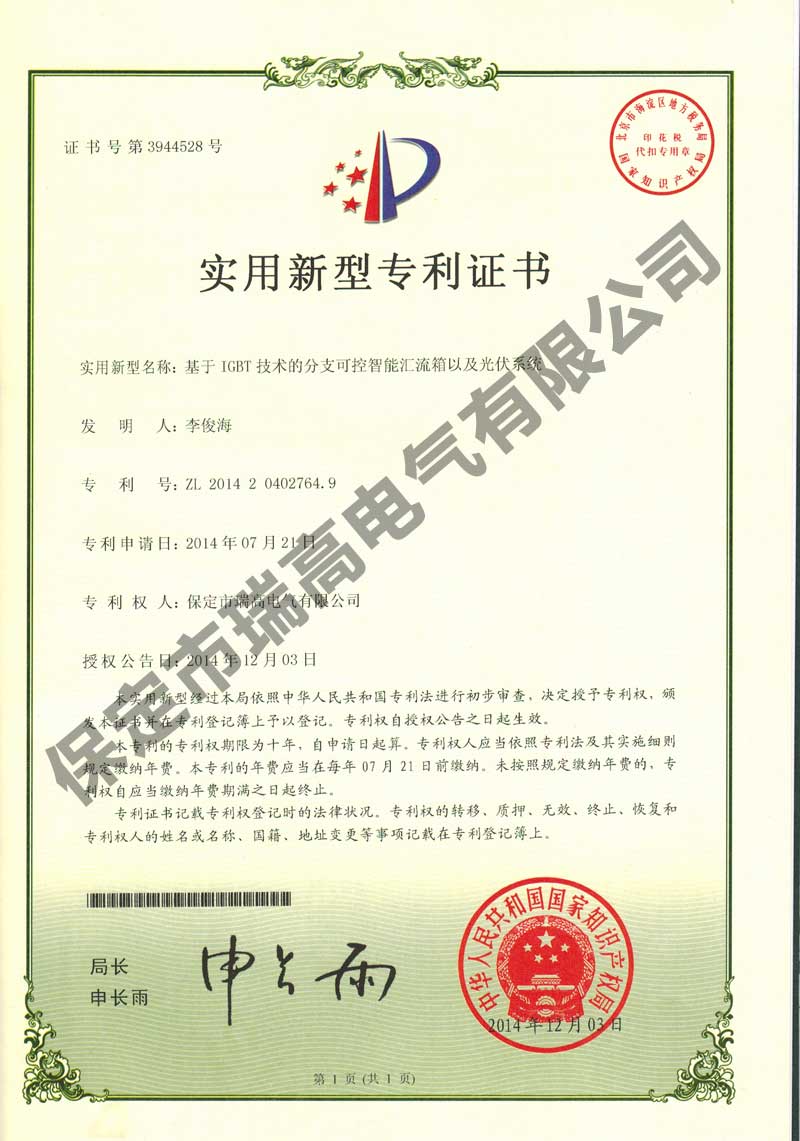 职业健康安全管理体系认证证书职业健康安全管理体系认证证书质量体系认证证书质量体系认证证书电池温度检测组件电池温度检测组件放电间隙放电间隙基于IGBT技术的分支可控智能汇流箱以及光伏系统基于IGBT技术的分支可控智能汇流箱以及光伏系统新型智能型变压器风冷控制柜实用新型专利证书新型智能型变压器风冷控制柜实用新型专利证书箱变智能监控系统箱变智能监控系统智能泄露电流监测传感装置以及泄露电流监测系统智能泄露电流监测传感装置以及泄露电流监测系统